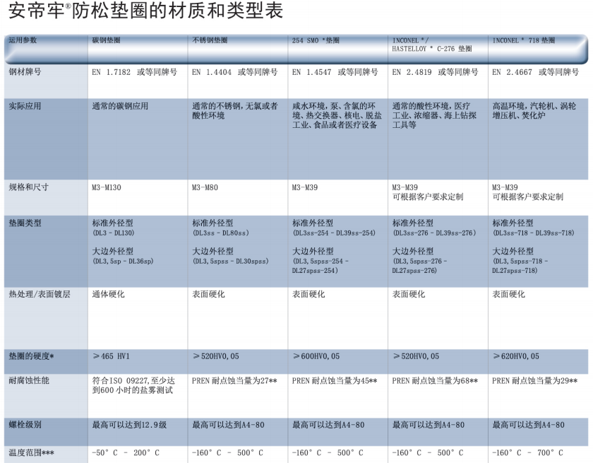 ANDI-LOCK防松墊圈提供以下材料和尺寸:碳鋼涂鋅墊圈 Delta Protekt(鋅薄片涂層 ),DL3-DL42(標準尺寸)和DL45-DL130(根據要求定制)。